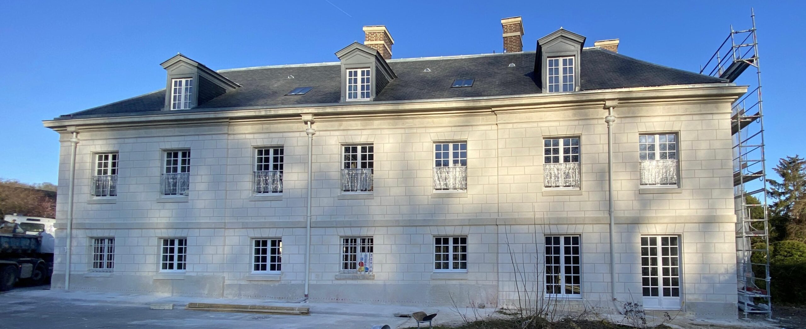 Chantier de restauration patrimoniale du Château d’Annel à Longueil-Annel. Les travaux ont porté sur la réfection des façades en pierre, la consolidation des éléments architecturaux historiques et la remise en état des parties dégradées, le tout dans le respect strict des normes du patrimoine afin de préserver l’authenticité du site.
